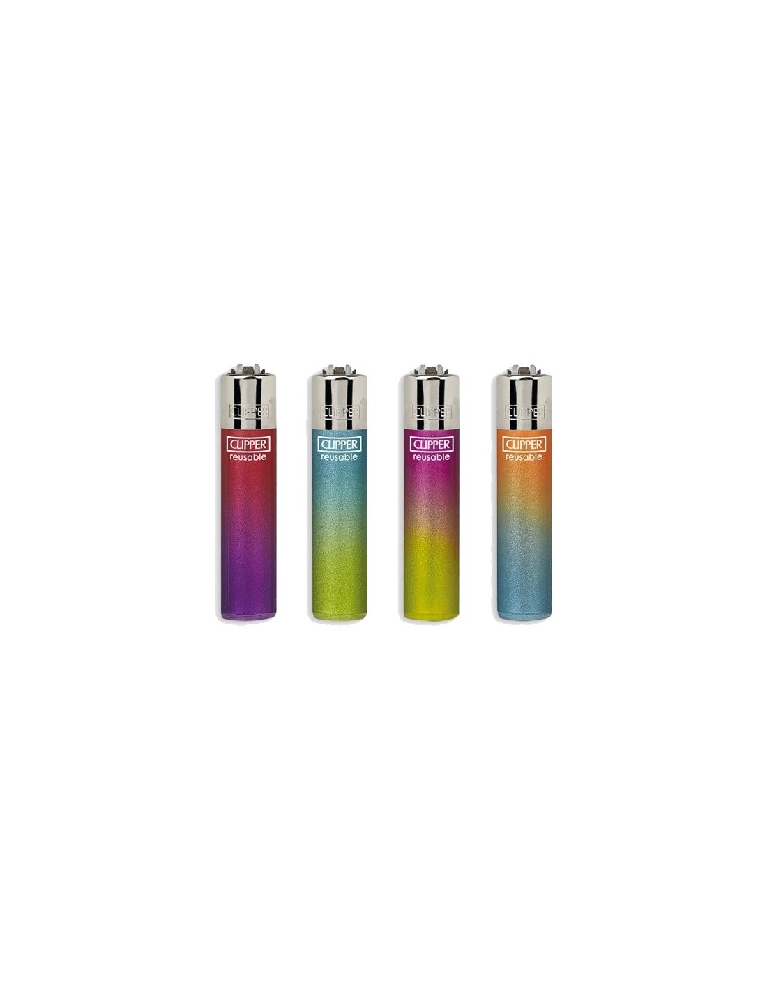 Quattro accendini originali Clipper Large della collezione Painted 9 con grafiche esclusive. Ricaricabili con flint sostituibile.