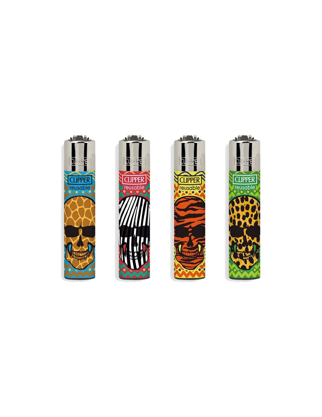 Quattro accendini originali Clipper Micro della collezione Wild Skulls con grafiche esclusive. Ricaricabili con flint sostituibile.