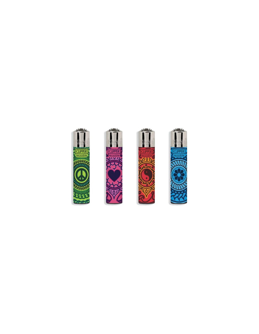 Quattro accendini originali Clipper Micro della collezione TRIBAL DAYS Serie 2 con grafiche esclusive.