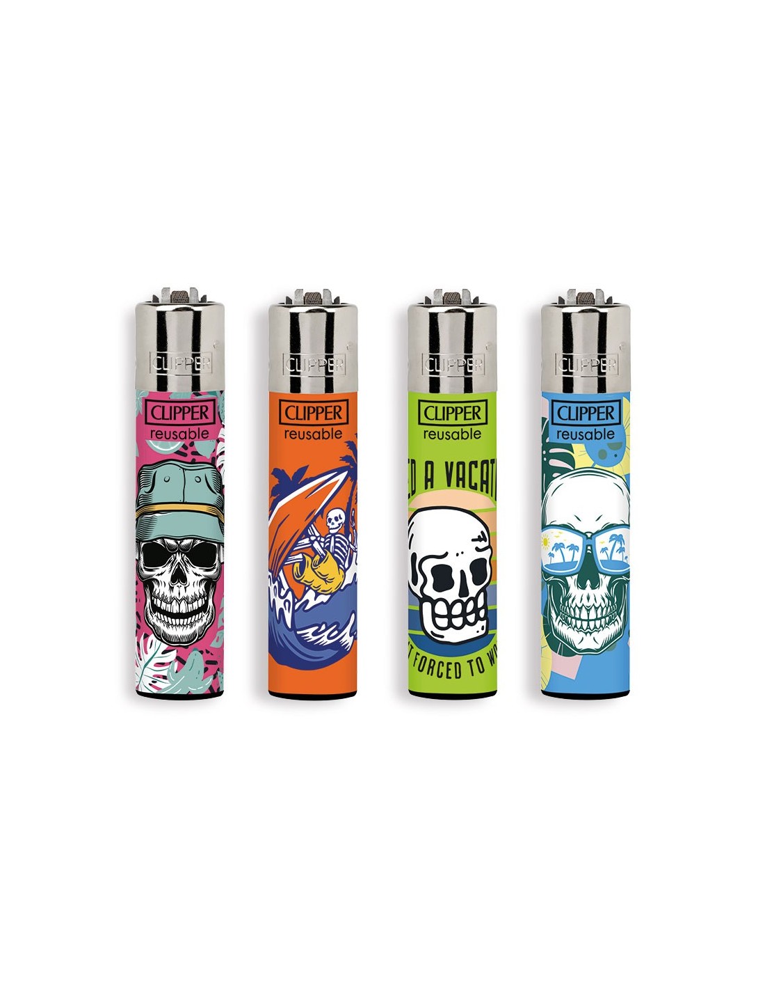 Quattro accendini originali Clipper Large della collezione VACAY SKULLS con grafiche esclusive.