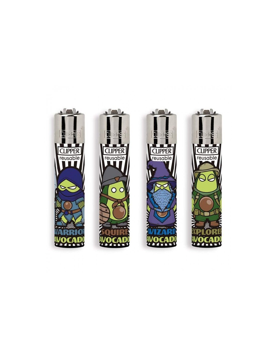 Quattro accendini originali Clipper Large della collezione AVOCADOS LEGEND con grafiche esclusive.