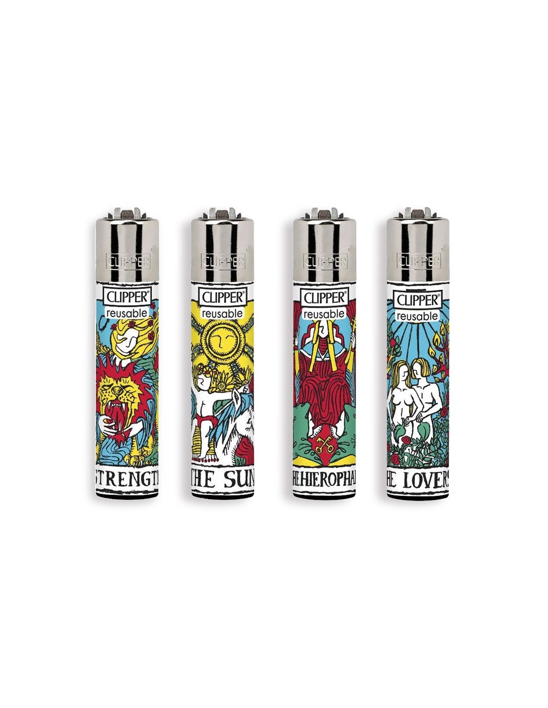Quattro accendini originali Clipper Large della collezione TAROT CARDS con grafiche esclusive.