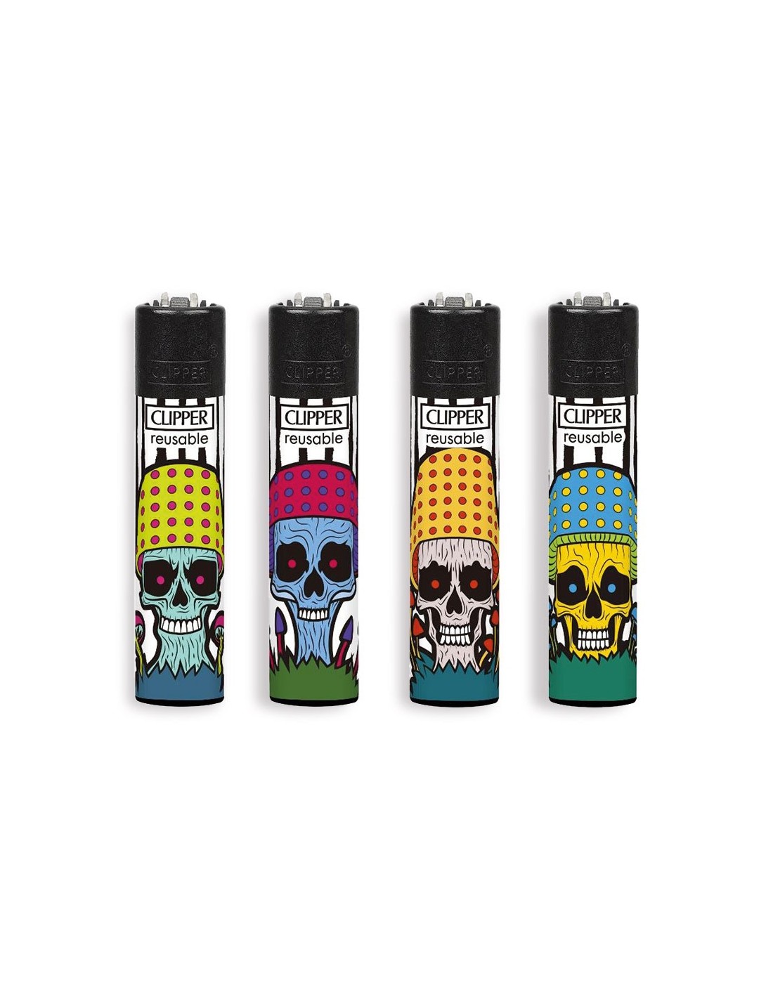 Quattro accendini originali Clipper Large della collezione HIPPIE VAN con grafiche esclusive.