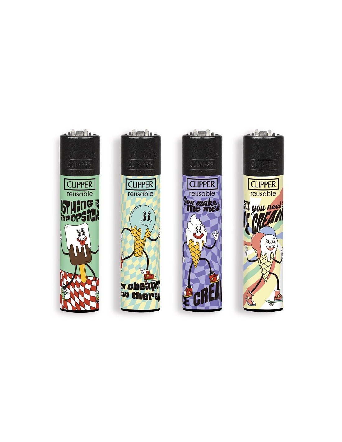 Quattro accendini originali Clipper Large della collezione TRENDY SENTENCES con grafiche esclusive.