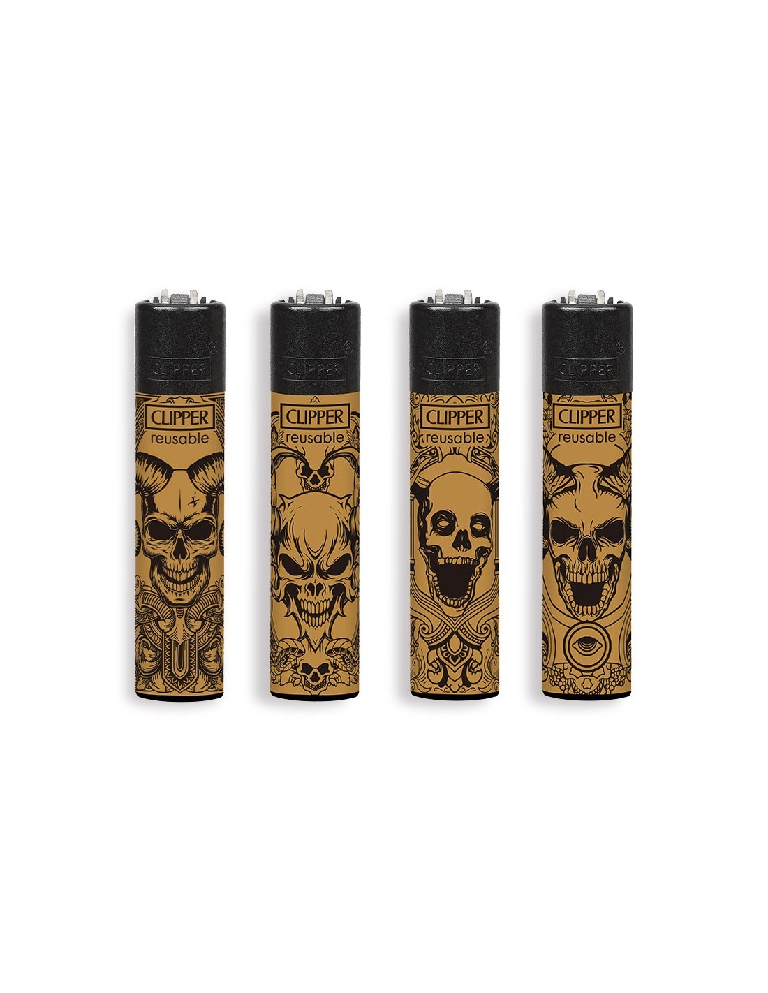 Quattro accendini originali Clipper Large della collezione LAUGHTER IN DARK con grafiche esclusive.