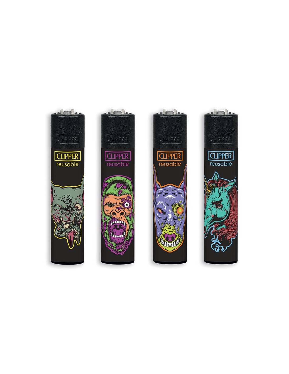 Quattro accendini originali Clipper Large della collezione ZOMBIE ANIMALS con grafiche esclusive.
