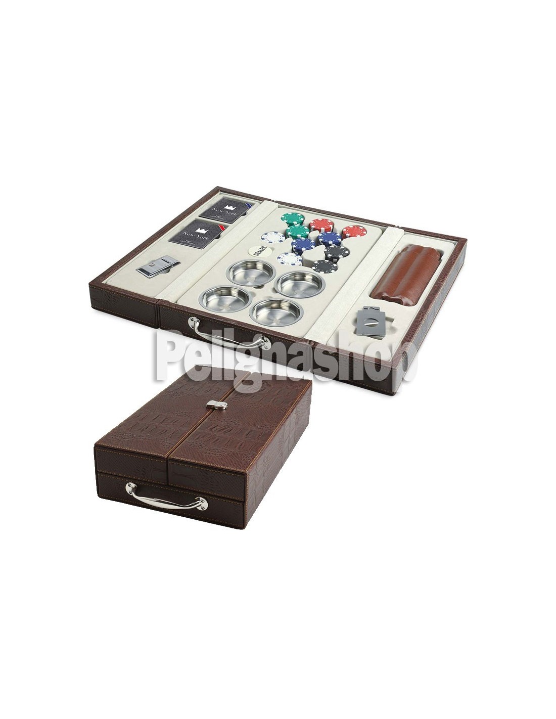 100 fiches da 11.5 gr, 1 Dealer, 1 accendino Denver, 1 Tagliasigari, 4 posaceneri in metallo, 1 portasigari in pelle, 2 mazzi da Poker