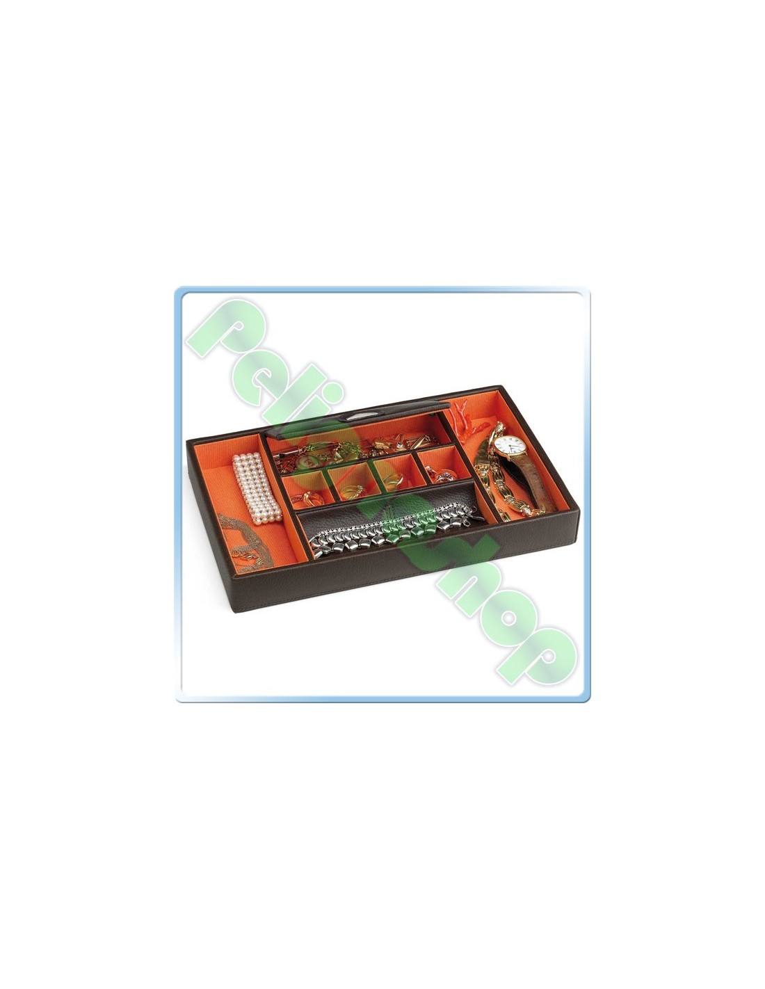Portagioie in ecopelle marrone con interno in tessuto arancio e zona centrale con coperchio.