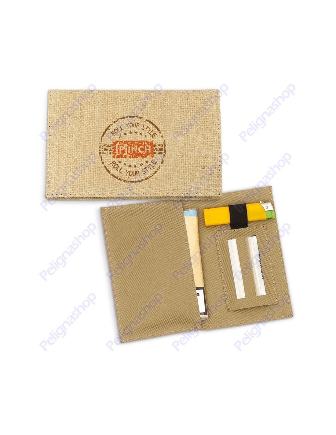 Portatabacco in fibra di iuta, porta cartine e accendino.